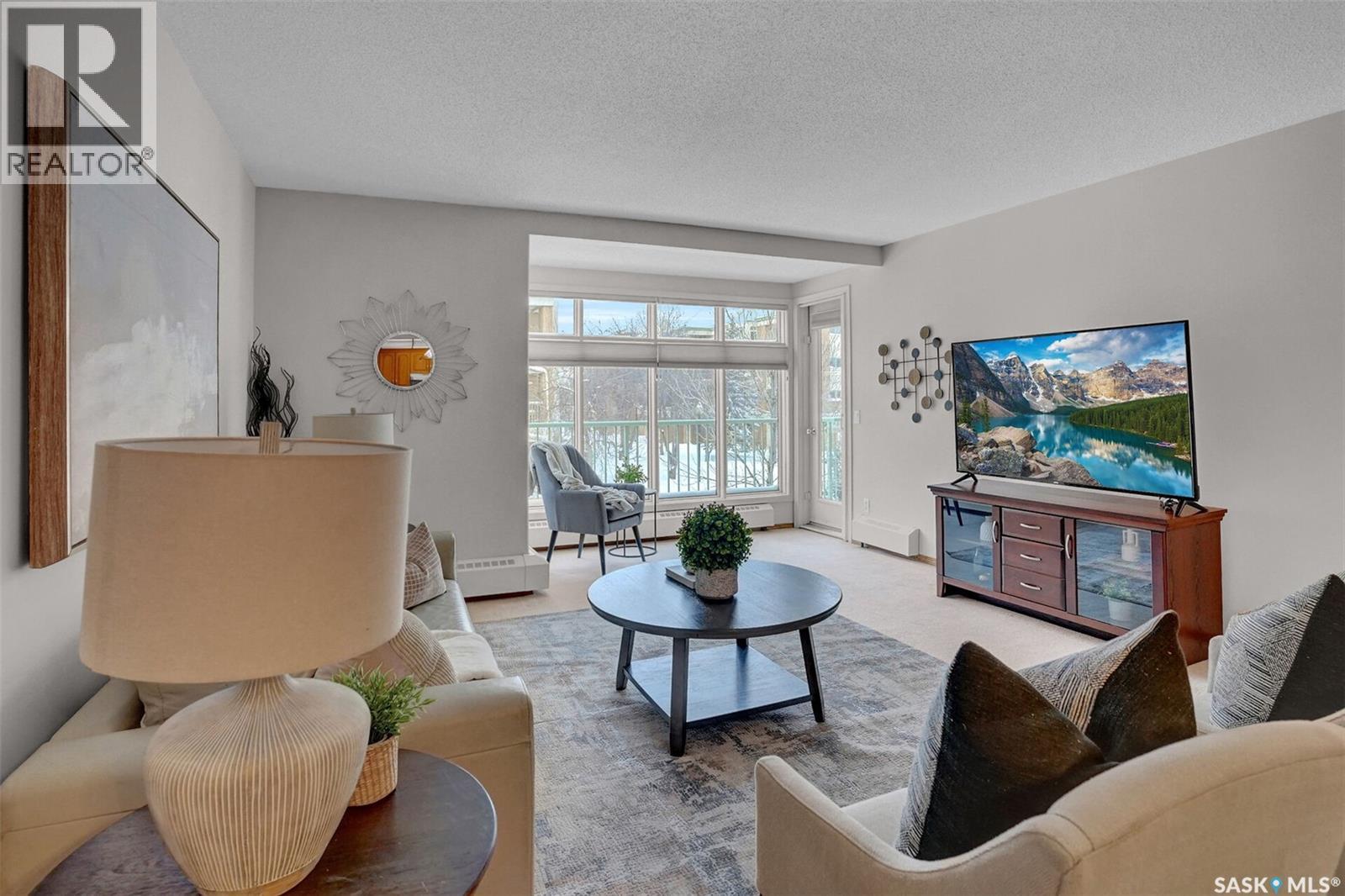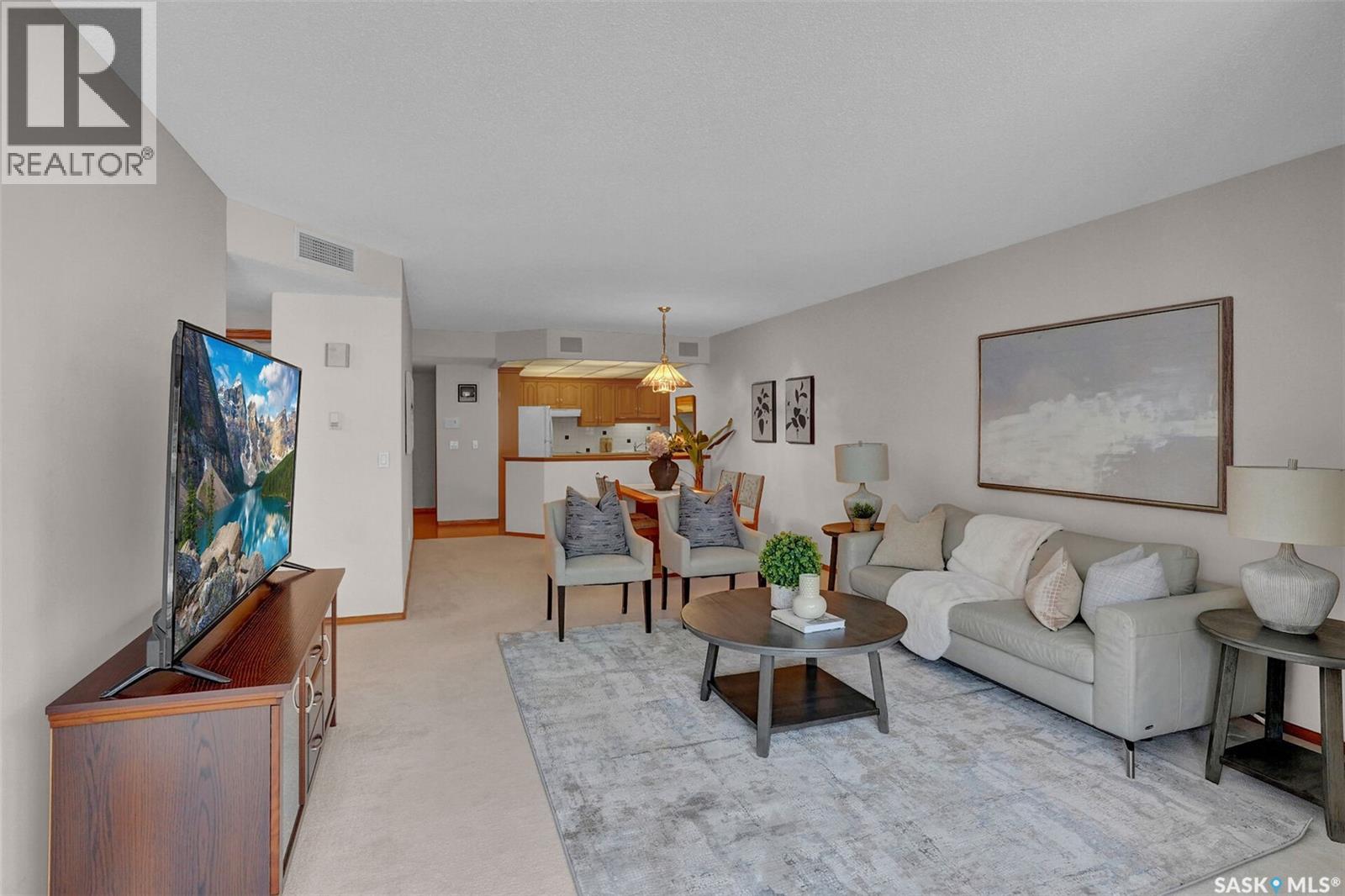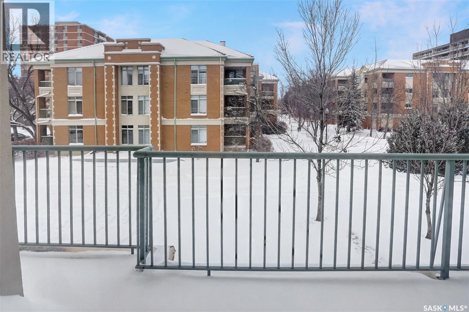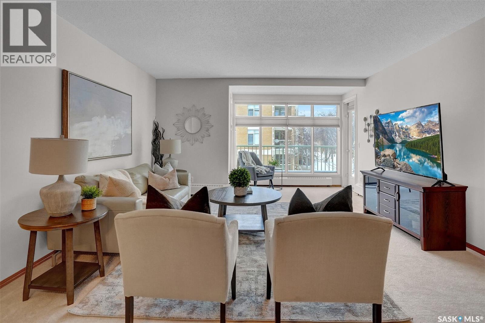 Welcome to this beautifully maintained 1,249 sq ft condo in the prestigious College Gardens complex. Offering 2 bedrooms and 2 bathrooms, this spacious unit combines comfort, functionality, and an unbeatable location directly across from Wascana Park. Filled with natural light, the open-concept living and dining areas are enhanced by a full wall of windows and direct access to your private balcony overlooking peaceful greenspace. The generous dining area easily accommodates large family gatherings, while the oak kitchen is in pristine condition and features a built-in oven and cooktop, tiled backsplash, pantry with pull-out drawers, and a bright eat-in nook. A large front foyer welcomes you into the unit, with a convenient laundry/storage room just off the entrance. The second bedroom is ideally suited as a guest room, home office, or library, with a 4-piece bathroom and linen closet located directly across the hall. The primary bedroom is a true retreat, offering space for a king-sized suite, a cozy reading nook with views of the greenspace, a 6'5" x 5'8" walk-in closet, and a private ensuite complete with a walk-in shower featuring dual seating. Constructed with concrete, this building provides exceptional soundproofing, privacy, and peace of mind. Additional highlights include one heated underground parking stall with a spacious 6'11" x 8'6" storage unit located directly in front of your parking space. Ideally situated with convenient access to downtown, the University of Regina, the airport, and the natural beauty of Wascana Park, this is condo living at its finest. (id:4069)