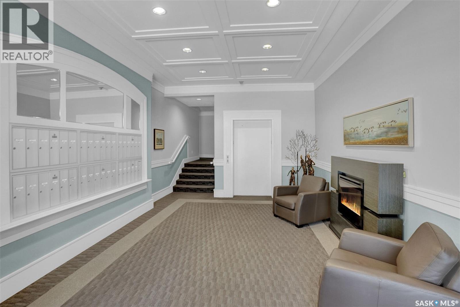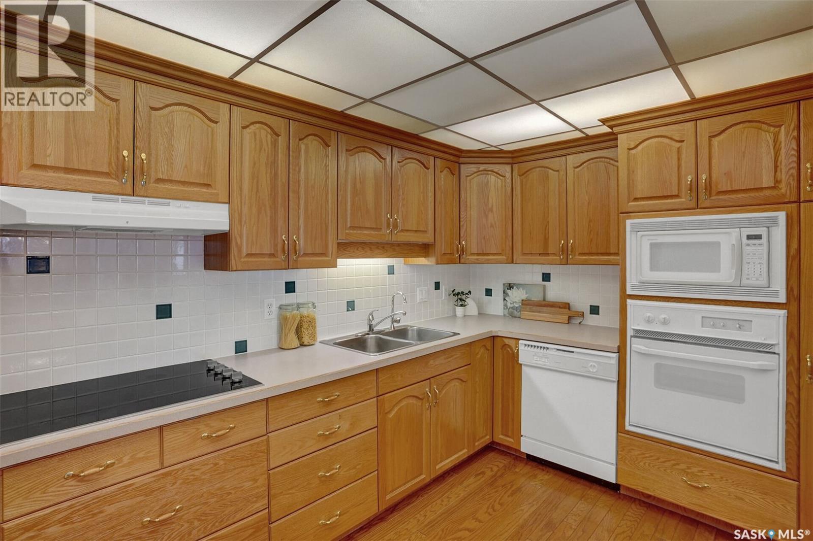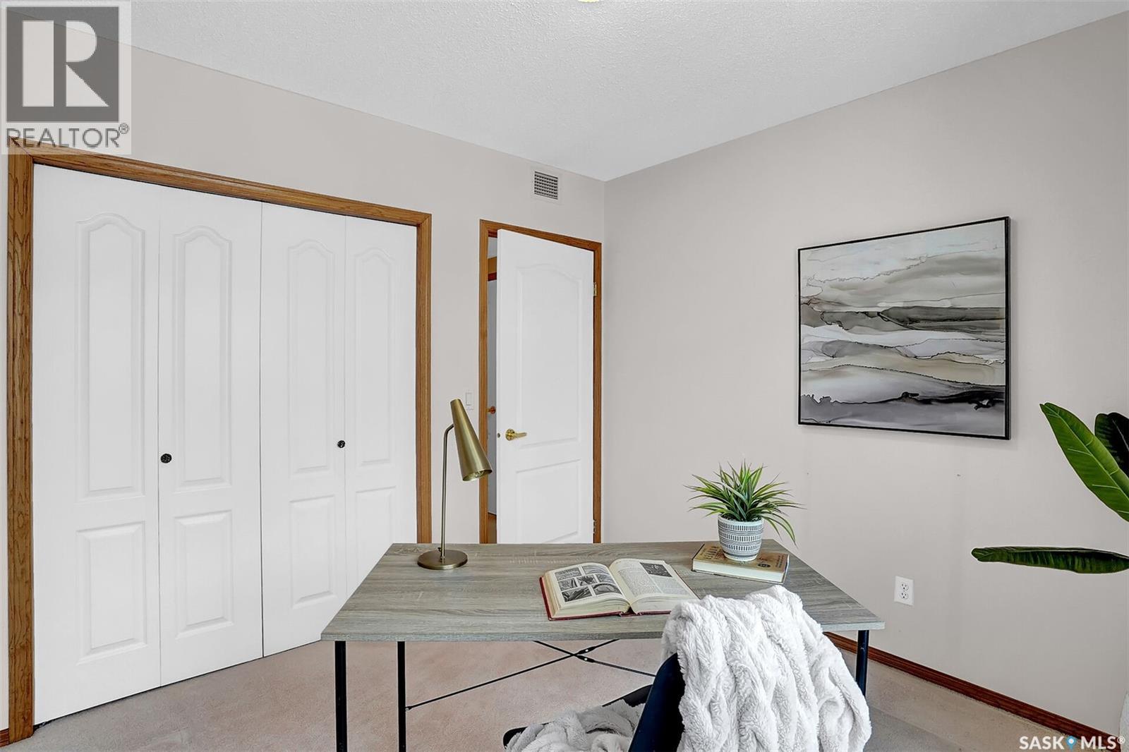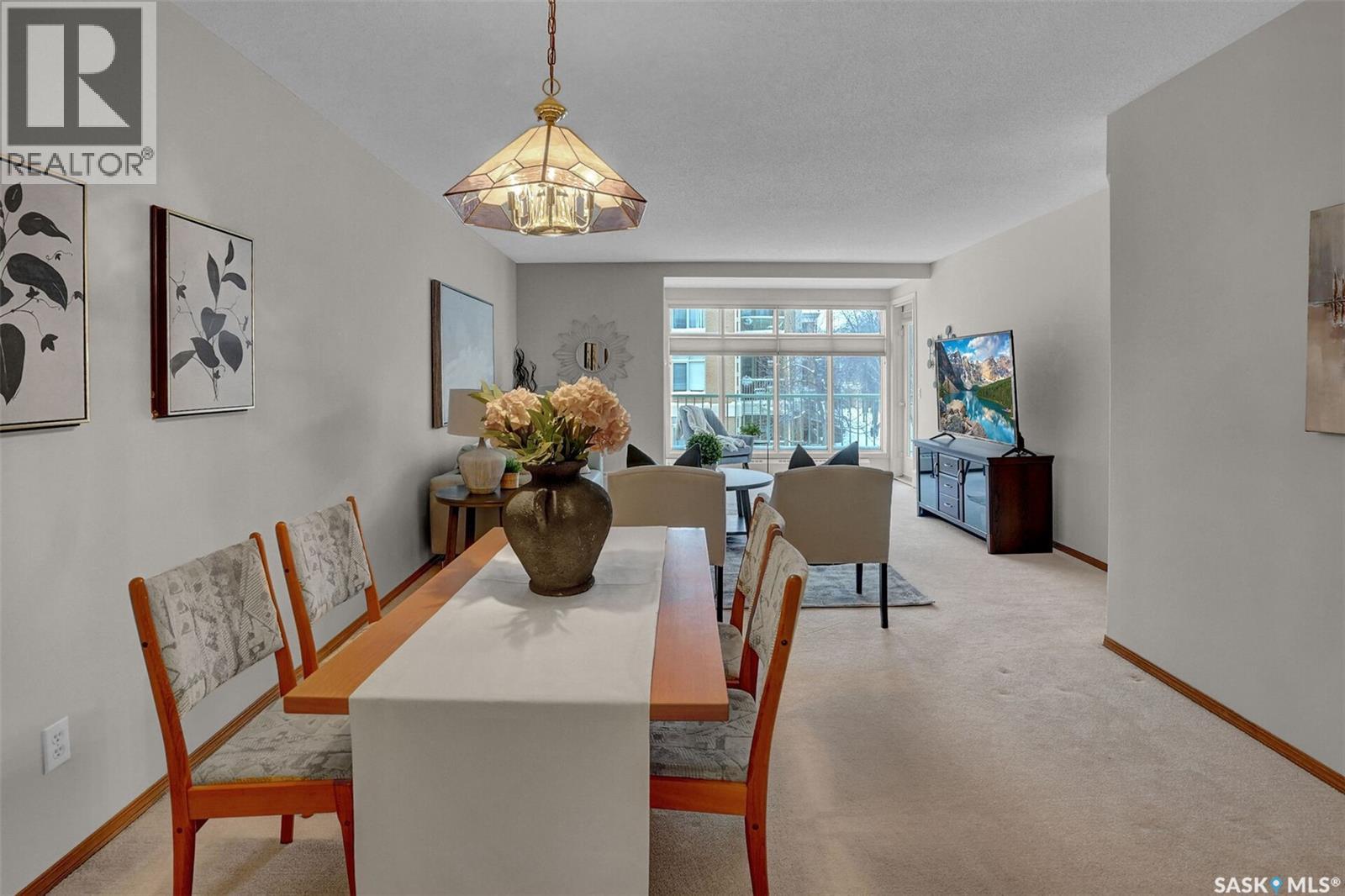 Welcome to this beautifully maintained 1,249 sq ft condo in the prestigious College Gardens complex. Offering 2 bedrooms and 2 bathrooms, this spacious unit combines comfort, functionality, and an unbeatable location directly across from Wascana Park. Filled with natural light, the open-concept living and dining areas are enhanced by a full wall of windows and direct access to your private balcony overlooking peaceful greenspace. The generous dining area easily accommodates large family gatherings, while the oak kitchen is in pristine condition and features a built-in oven and cooktop, tiled backsplash, pantry with pull-out drawers, and a bright eat-in nook. A large front foyer welcomes you into the unit, with a convenient laundry/storage room just off the entrance. The second bedroom is ideally suited as a guest room, home office, or library, with a 4-piece bathroom and linen closet located directly across the hall. The primary bedroom is a true retreat, offering space for a king-sized suite, a cozy reading nook with views of the greenspace, a 6'5" x 5'8" walk-in closet, and a private ensuite complete with a walk-in shower featuring dual seating. Constructed with concrete, this building provides exceptional soundproofing, privacy, and peace of mind. Additional highlights include one heated underground parking stall with a spacious 6'11" x 8'6" storage unit located directly in front of your parking space. Ideally situated with convenient access to downtown, the University of Regina, the airport, and the natural beauty of Wascana Park, this is condo living at its finest. (id:4069)
