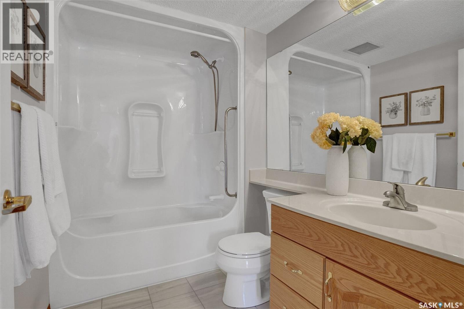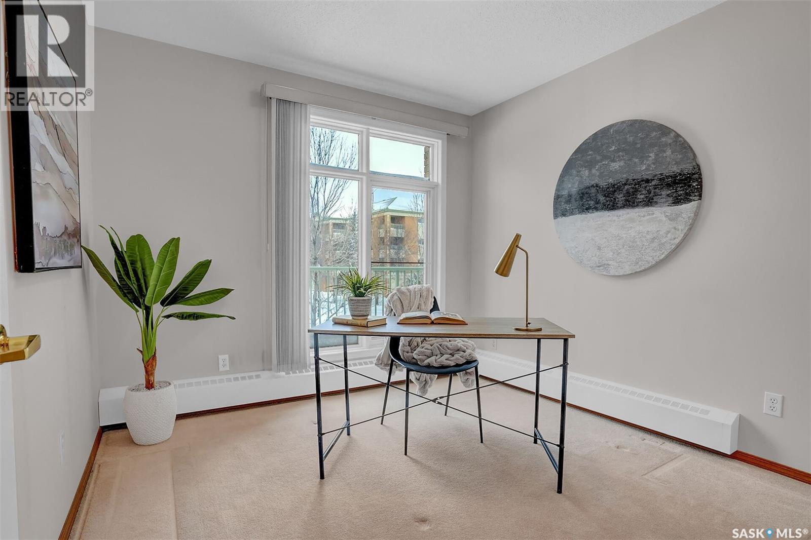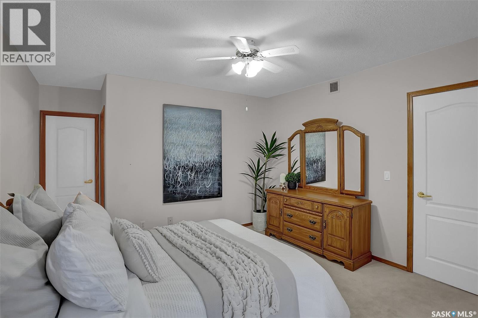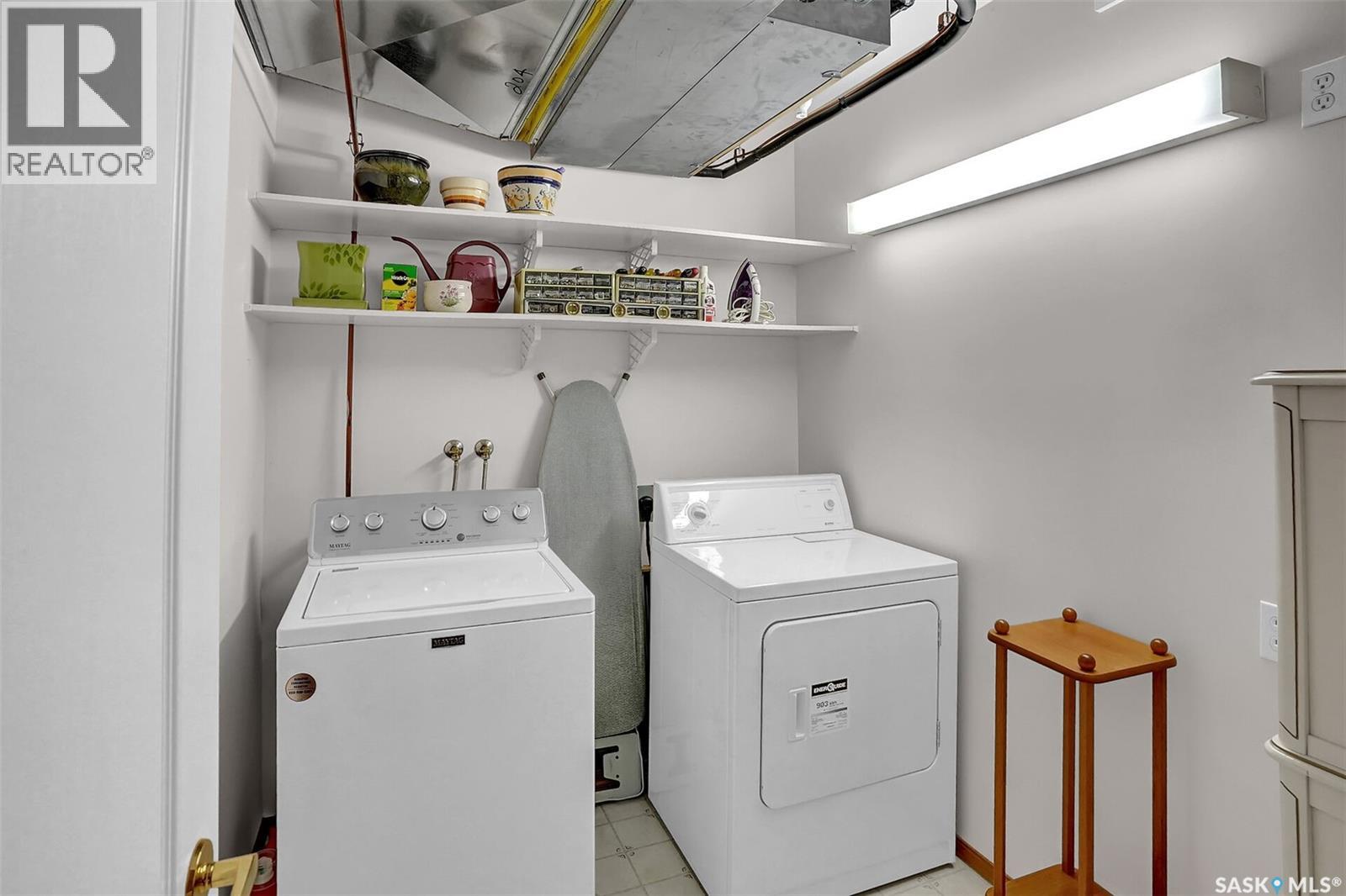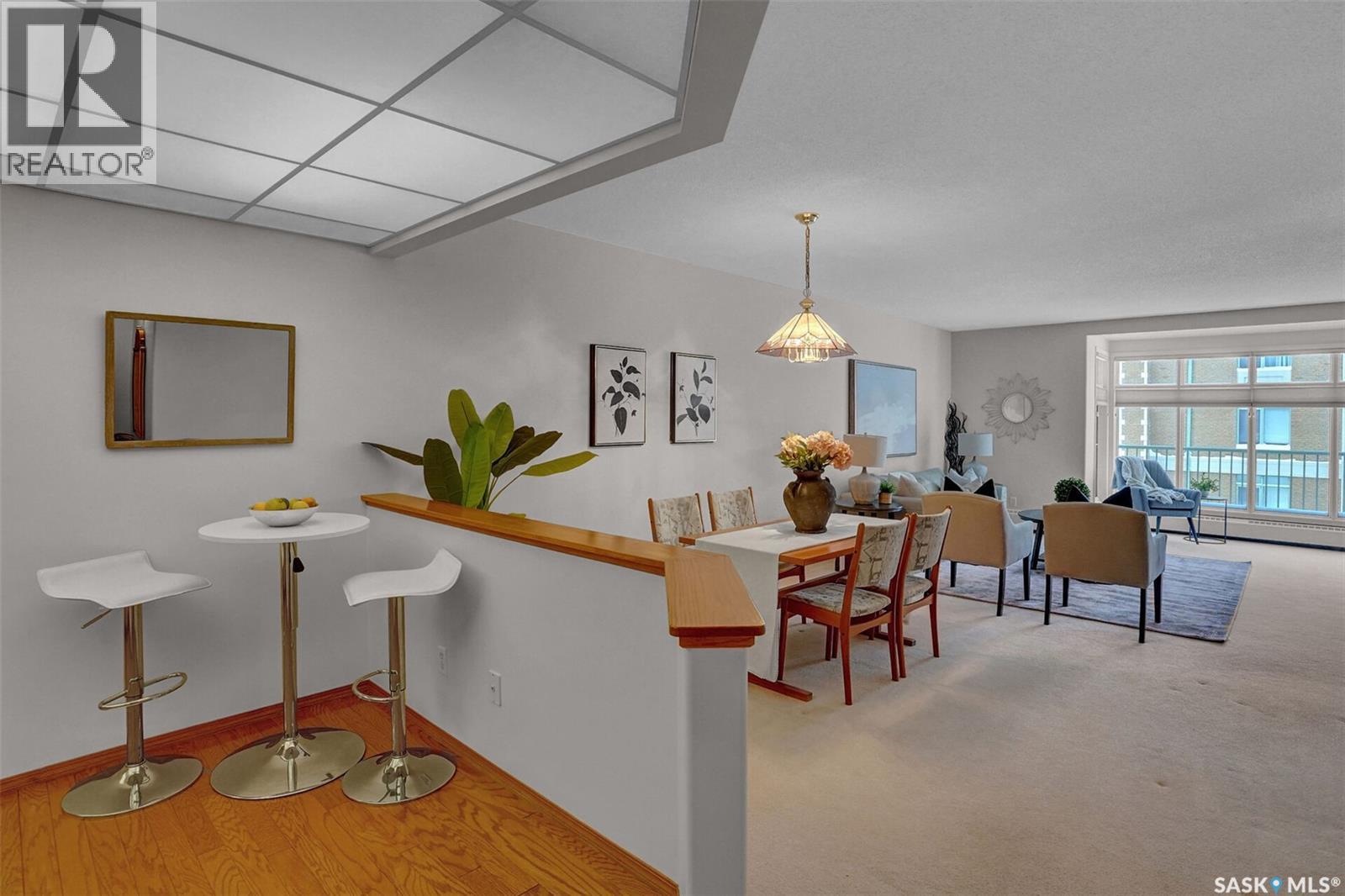 Welcome to this beautifully maintained 1,249 sq ft condo in the prestigious College Gardens complex. Offering 2 bedrooms and 2 bathrooms, this spacious unit combines comfort, functionality, and an unbeatable location directly across from Wascana Park. Filled with natural light, the open-concept living and dining areas are enhanced by a full wall of windows and direct access to your private balcony overlooking peaceful greenspace. The generous dining area easily accommodates large family gatherings, while the oak kitchen is in pristine condition and features a built-in oven and cooktop, tiled backsplash, pantry with pull-out drawers, and a bright eat-in nook. A large front foyer welcomes you into the unit, with a convenient laundry/storage room just off the entrance. The second bedroom is ideally suited as a guest room, home office, or library, with a 4-piece bathroom and linen closet located directly across the hall. The primary bedroom is a true retreat, offering space for a king-sized suite, a cozy reading nook with views of the greenspace, a 6'5" x 5'8" walk-in closet, and a private ensuite complete with a walk-in shower featuring dual seating. Constructed with concrete, this building provides exceptional soundproofing, privacy, and peace of mind. Additional highlights include one heated underground parking stall with a spacious 6'11" x 8'6" storage unit located directly in front of your parking space. Ideally situated with convenient access to downtown, the University of Regina, the airport, and the natural beauty of Wascana Park, this is condo living at its finest. (id:4069)