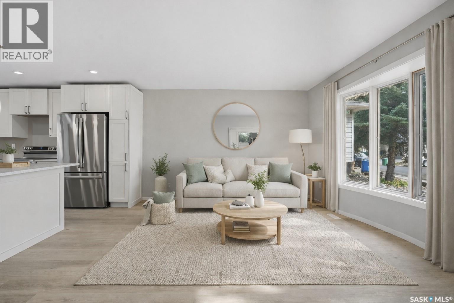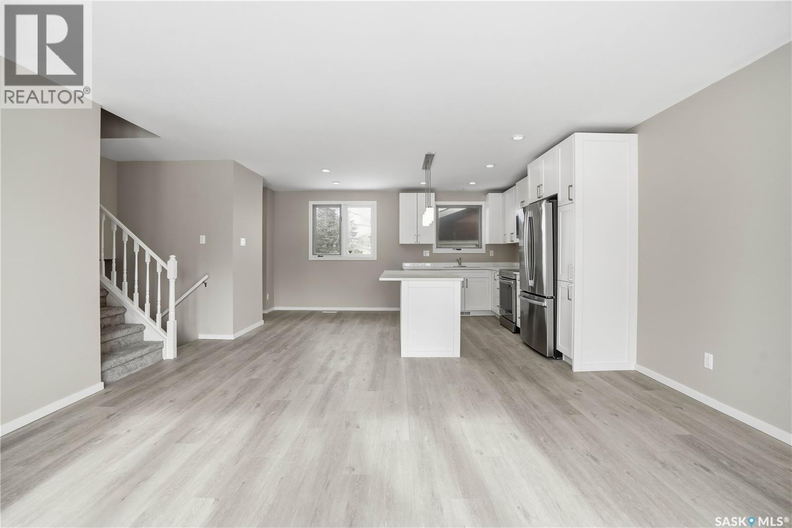 Welcome to this renovated 1,302 sq. ft. four-level split in Uplands, offering modern finishes, thoughtful design, and a prime location backing green space. Uplands is a "hidden value" neighborhood in North Regina, offering an established, quiet, and family-friendly atmosphere with a high rate of homeownership.The area features extensive green spaces, including walking paths, tennis courts, and football/soccer fields. It is home to Regina's largest toboggan hill and a speed skating oval for winter activities, plus Currie Field, located within the vicinity, is a premier venue for baseball/softball. The main floor features an inviting front foyer leading to a spacious living room with a bright bay window. The open-concept layout showcases stunning vinyl plank flooring throughout, with a modern kitchen with a large island, white cabinetry with soft-close doors and drawers, quartz countertops, stainless steel appliances, and a pantry beside the fridge. The sink overlooks the backyard, while the dining area sits just off the kitchen, making it ideal for entertaining. Convenient main-floor laundry and direct yard access complete this level. Upstairs, the second level offers plush new carpeting, two comfortable bedrooms, and a stylish 4-piece bathroom with a tiled tub surround. The third level includes two more bedrooms with matching carpet and a convenient 2-piece bathroom. On the fourth level, you’ll find the mechanical room and a spacious rec room perfect for family movie nights or a play area. A single detached garage provides secure parking and additional storage. (id:4069)