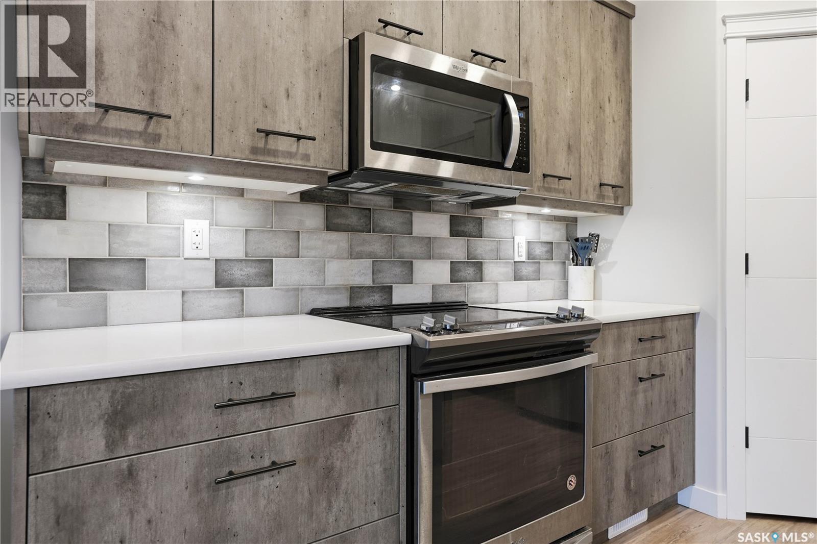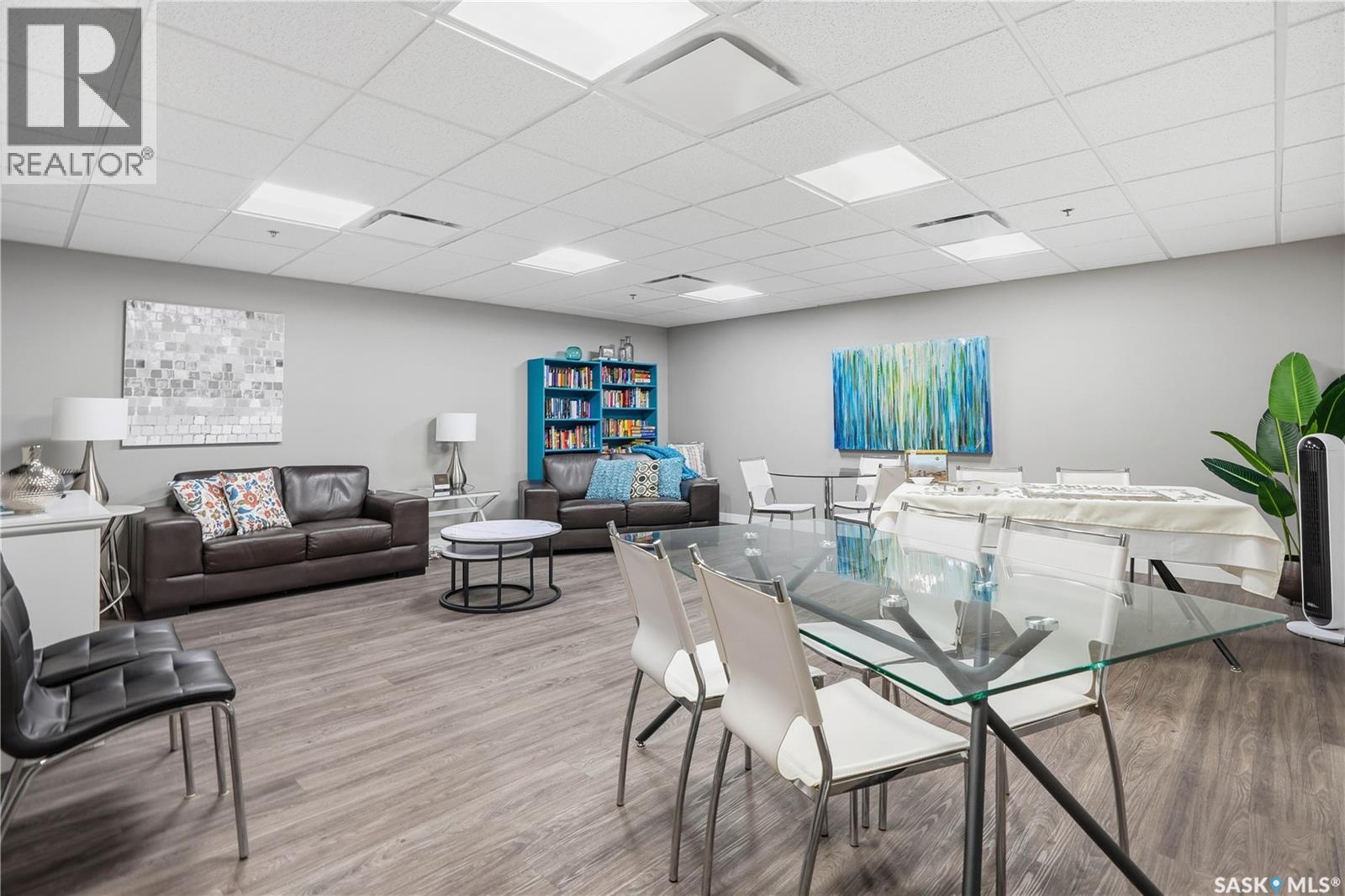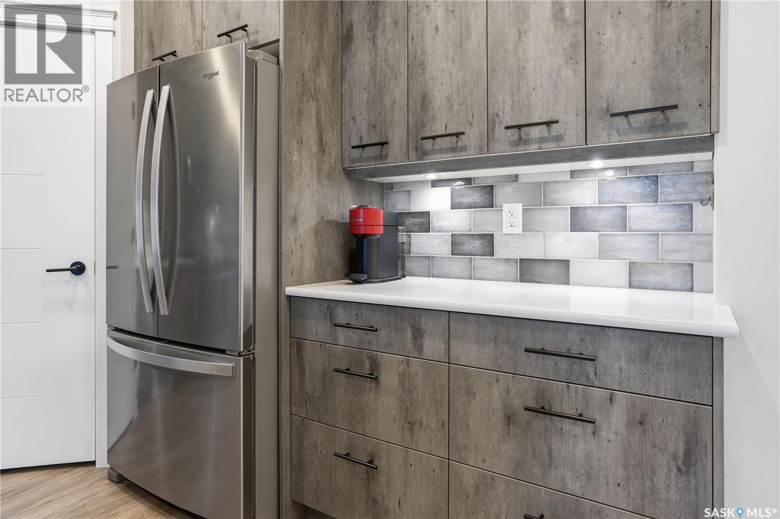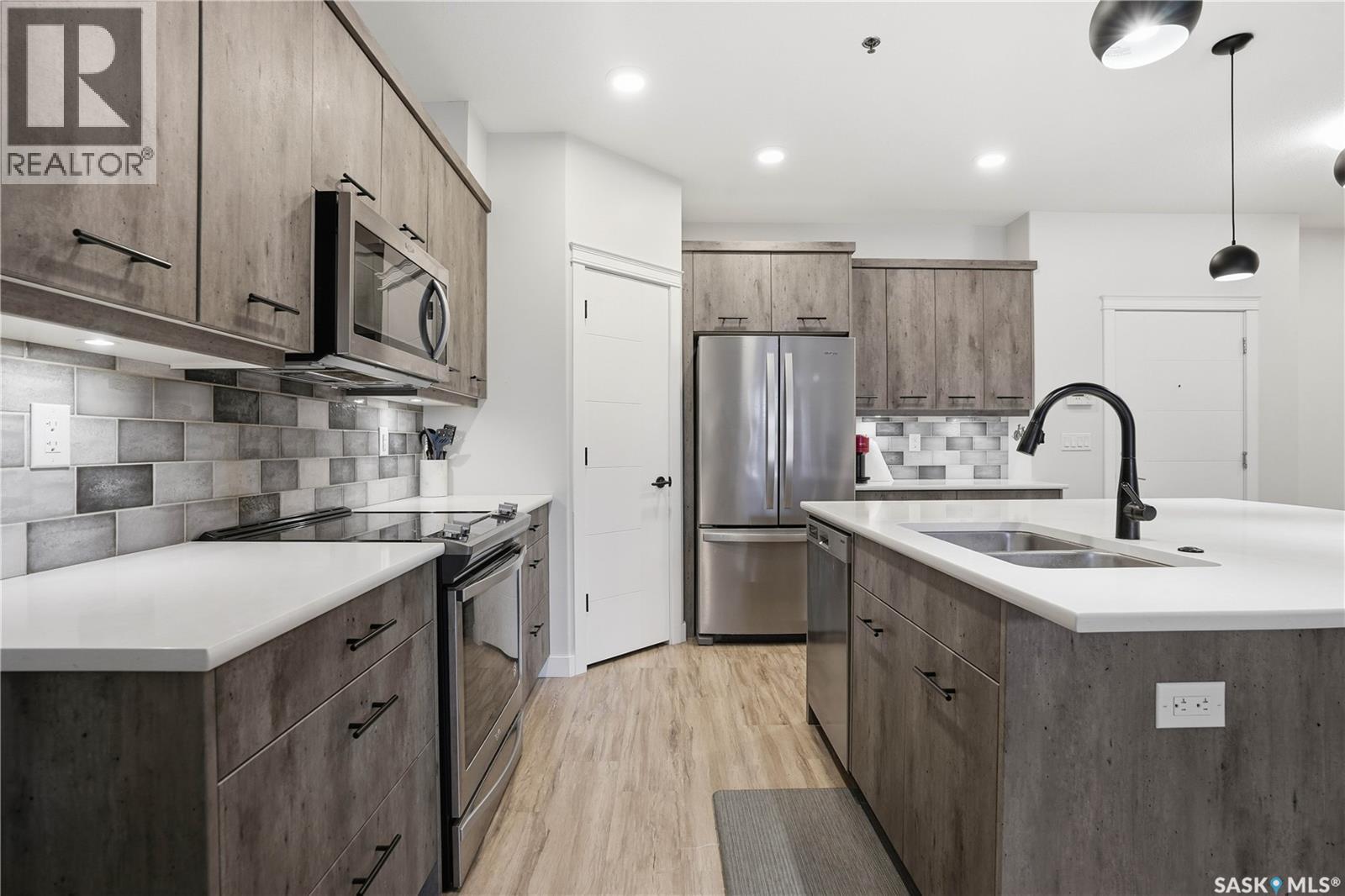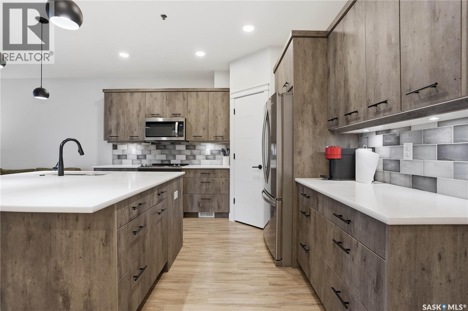 Welcome to this beautifully finished 1,130 sq ft condo offering 2 bedrooms and 2 bathrooms with a bright, open-concept layout. Wide plank vinyl flooring runs throughout the majority of the unit, creating a modern and cohesive feel. The stylish kitchen features white granite countertops, a large island with seating, stainless steel appliances, corner pantry, tiled backsplash, and striking black pendant lighting above the island. The living room offers a patio door leading to your private balcony, while the dining area near the front entrance easily accommodates a large table—perfect for entertaining. The spacious primary bedroom features plush carpeting, a large walk-in closet (5 x 8), and an impressive ensuite with double sinks, granite countertops, and a walk-in shower. A second bedroom provides flexible space for guests or a home office. The unit also includes a 4-piece main bathroom and a convenient laundry area with tiled flooring. Additional highlights include a heated underground parking stall and private storage. The secure building offers an elevator, amenities room, and a shared rooftop patio for residents to enjoy. Ideally located close to downtown, Wascana Park, and with easy access to the University of Regina. (id:4069)