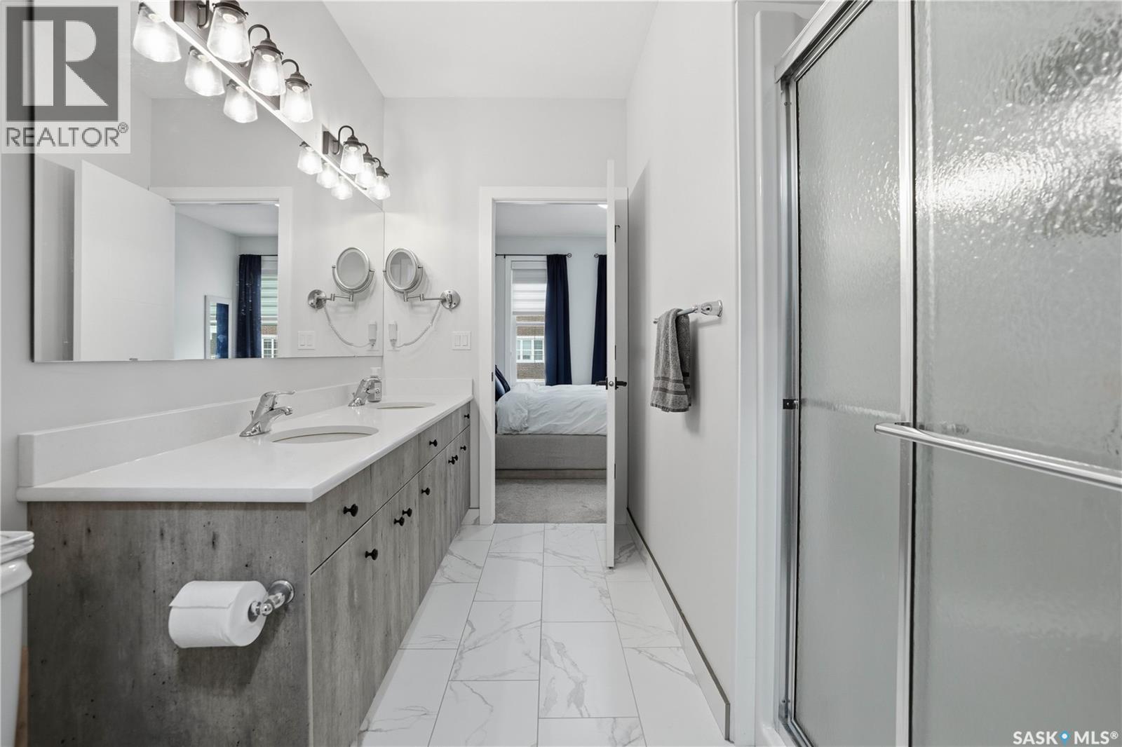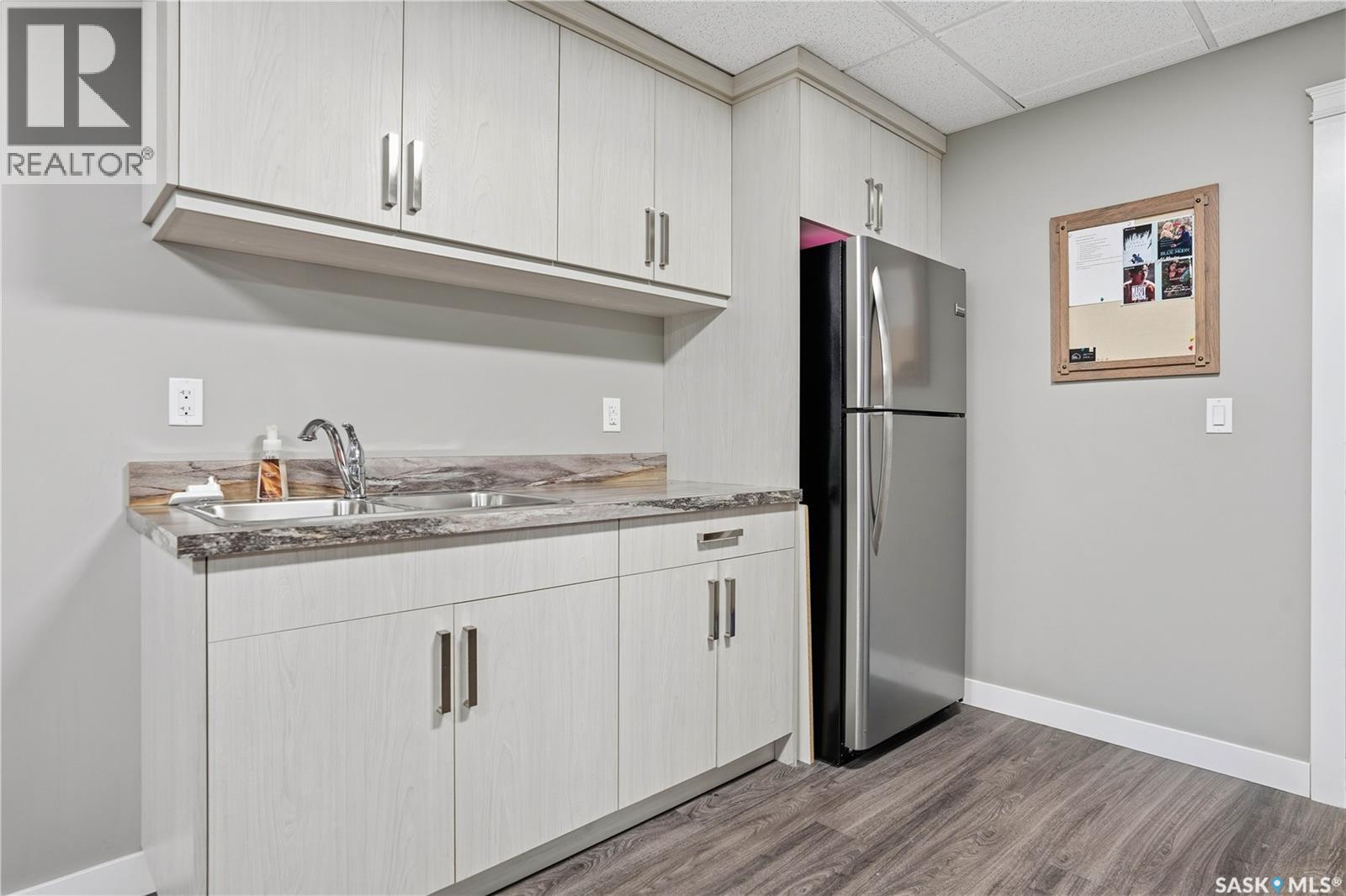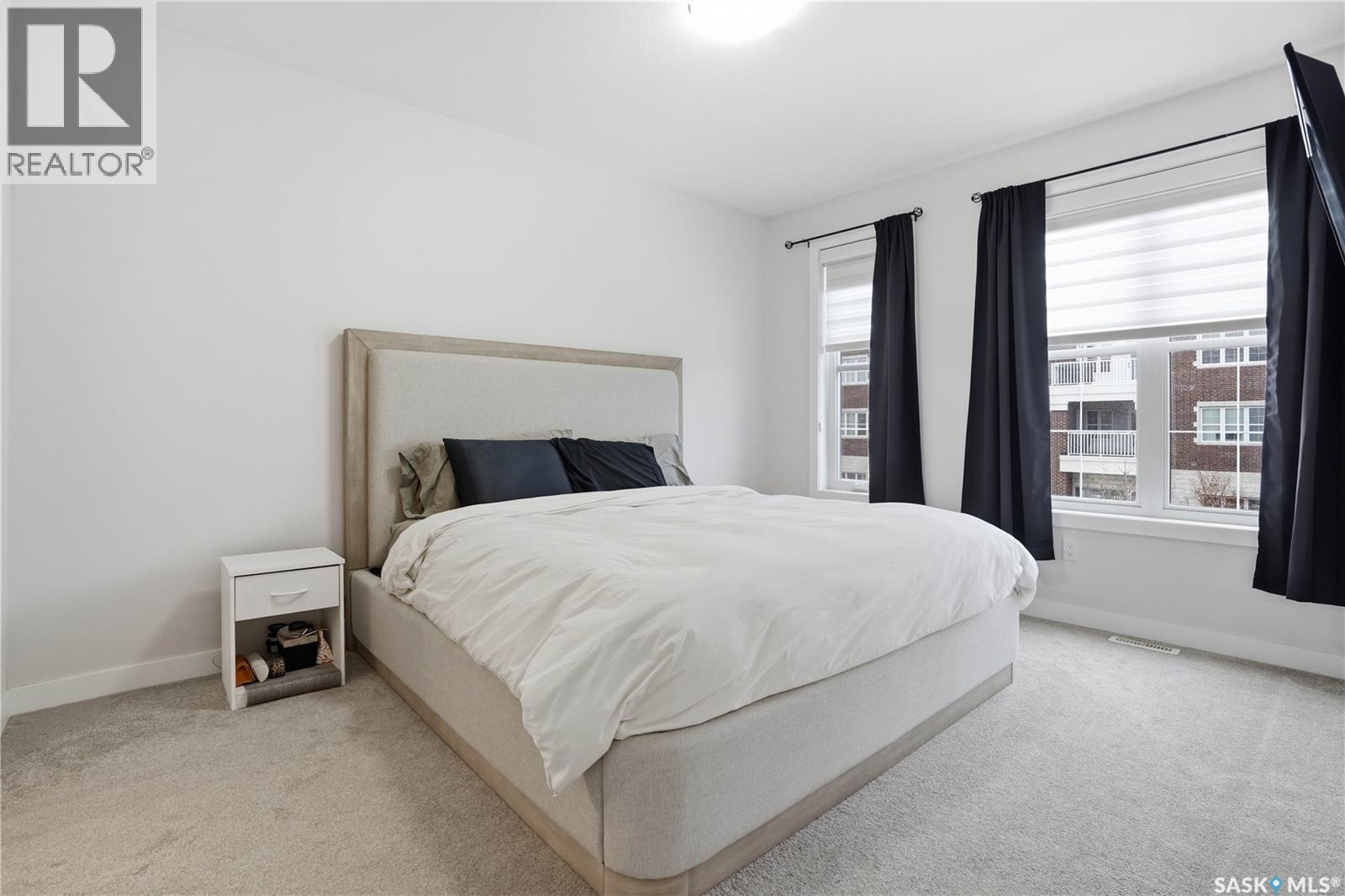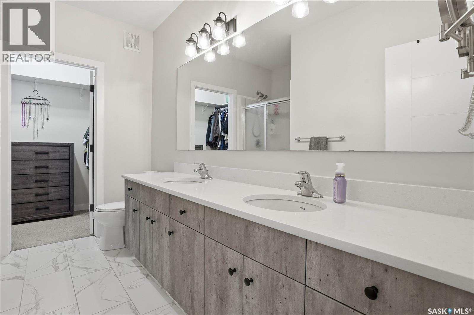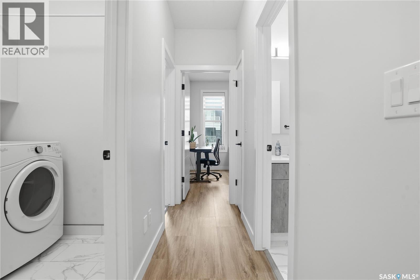 Welcome to this beautifully finished 1,130 sq ft condo offering 2 bedrooms and 2 bathrooms with a bright, open-concept layout. Wide plank vinyl flooring runs throughout the majority of the unit, creating a modern and cohesive feel. The stylish kitchen features white granite countertops, a large island with seating, stainless steel appliances, corner pantry, tiled backsplash, and striking black pendant lighting above the island. The living room offers a patio door leading to your private balcony, while the dining area near the front entrance easily accommodates a large table—perfect for entertaining. The spacious primary bedroom features plush carpeting, a large walk-in closet (5 x 8), and an impressive ensuite with double sinks, granite countertops, and a walk-in shower. A second bedroom provides flexible space for guests or a home office. The unit also includes a 4-piece main bathroom and a convenient laundry area with tiled flooring. Additional highlights include a heated underground parking stall and private storage. The secure building offers an elevator, amenities room, and a shared rooftop patio for residents to enjoy. Ideally located close to downtown, Wascana Park, and with easy access to the University of Regina. (id:4069)